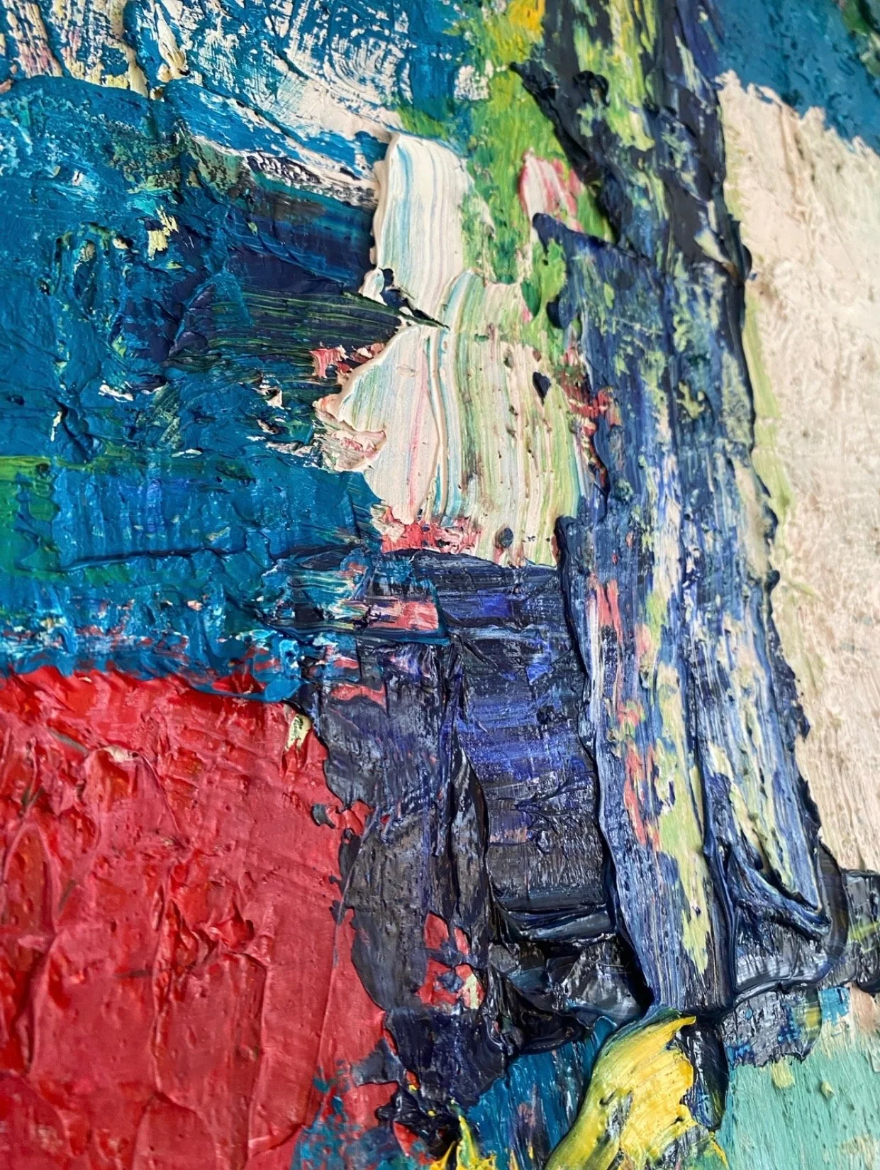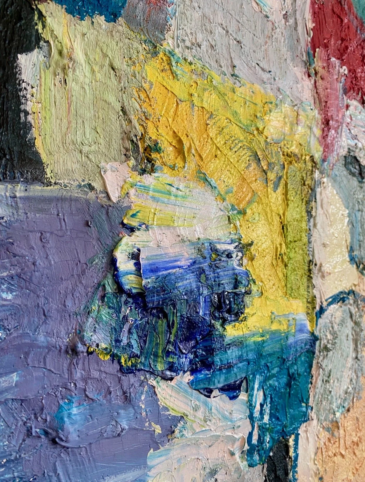 Built through numerous layers of oil paint applied over an extended period, the surface carries substantial material depth. Thick passages of paint were laid down, allowed to rest, reworked, and revisited—each layer responding to the drying time and resistance of the one beneath it. The result is a richly textured surface that records time, decision, and restraint as much as gesture.