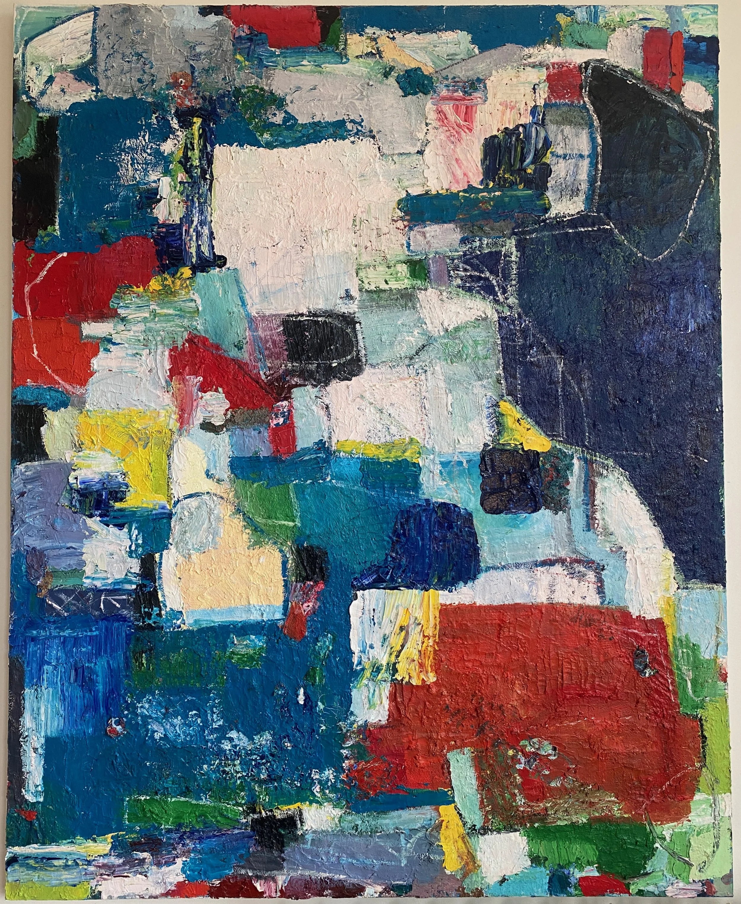 Formally, the composition explores power not as dominance, but as structure: how mass, pressure, and balance coexist. Shapes push and yield against one another, suggesting systems—architectural, psychological, social—that are constantly negotiated rather than fixed. Color functions both as tension and resolution, moving the eye across the surface while holding the composition in equilibrium.
